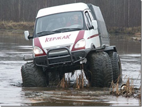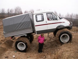Знакомьтесь - «Кержак». Суть идеи: снегоболотоход с грузоподъемностью большей, нежели у известных уже «Трэкол», вдобавок доступный по цене. Опытный образец создан в НИИ транспортных машин при Нижегородском государственном техническом университете. Соседство с ГАЗом определило выбор автомобиля-основы: это ГАЗ-33023 с 6-местной удлиненной кабиной. Став «биг-футом», он по-прежнему способен перевезти тонну груза на плотных грунтах. Самые сильные «Трэколы» берут на 200 кг меньше.