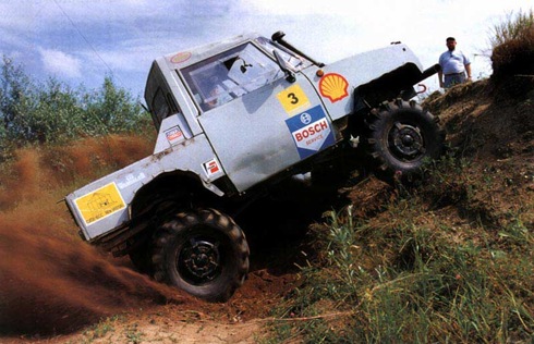 И тут у нас начинаются проблемы... Собственно, затруднения такого рода мы испытываем практически со всеми подготовленными машинами. Ведь это стандартная машина всегда готова, как дрессированная собачка, "подать лапку". А попробуй-ка найти перегиб рельефа, способный и колесо вывесить, и машину не опрокинуть! Хотя, по правде говоря, перевернуть этот автомобиль совсем непросто (несмотря на то что машина выглядит очень высокой, ее центр тяжести расположен достаточно низко). Кстати, в ходе наших маневров выявились две, пусть и не самые большие, но весьма неприятные проблемы. И обе они связаны с резиной. Во-первых, тракторная Я-358, смонтированная на штатных дисках, здорово цепляет за раму при повороте колес, издавая мерзкое "тррр". Вопрос, разумеется, могли бы решить диски с отрицательным вылетом, но вот беда: поскольку машина уникальная, то и посадочные параметры дисков у нее не менее уникальные! Ну а во-вторых, выяснилось, что тракторная резина не очень-то любит сухое бездорожье с резким рельефом. И чуть что колеса, как фрезы, начинают вгрызаться в земную твердь (особенно на крутых подъемах). Песок фонтаном, а толку ни на грош. Но зато в грязи машина на этой резине ведет себя просто замечательно! Например, болотце с илистым дном, где совсем недавно крепко засела подготовленная для триалов "Нива" Олафа Фогеля, наш "медвежонок" преодолевал в любом направлении. Хочешь - вдоль, хочешь - поперек... Понравилась мне и работа амортизаторов от ГАЗ-53.