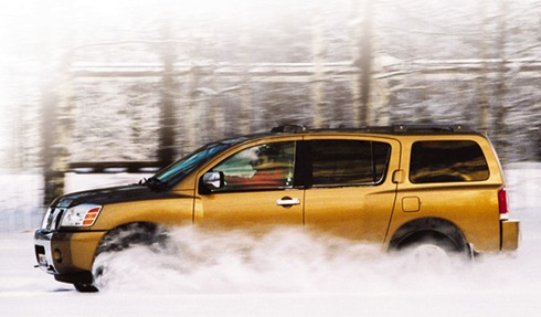 Посовещавшись, решаем довести сложность «миссии» до заведомой невыполнимости: штурм заснеженного холма с уклоном градусов в тридцать пять. Включаем «понижайку» и практически на холостом ходу отправляемся в путь. Был момент, когда мы усомнились в благополучном завершении восхождения — колеса стали срываться на юз. Но тут-то и выручил мощный двигатель: газ в пол, и Armada, выбросив из-под колес пару кубометров снега, победоносно выскакивает на вершину. Да, впечатляет. А ведь поначалу казалось, что эта машина предназначена лишь для пуганья легковушек и «кидания понтов», что бегать она может по асфальту и, в лучшем случае, по хорошему проселку. Ошибались. Pathfinder Armada — самый настоящий внедорожник.