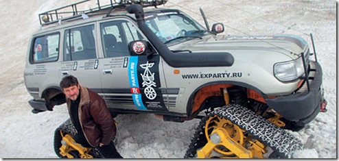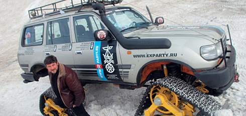 ФУЛИДИ Нет, это наш, законнорожденный. Зовут его "Хазар". Сначала был обычный Land Cruiser 80GX. "Хазаром" же он стал после того, как мы с ним хорошенько поработали. Провели бодилифт и лифтинг подвески для того, чтобы можно было установить колеса большего диаметра и ширины. Поставили восемь амортизаторов с увеличенным ходом и предохраняющими элементами, все сайлент-блоки заменили на полиуретановые. Спрятали под бампер сверхмощную лебедку. Установили автономную систему подогрева двигателя. Ну и, конечно же, бак на 160 л, что по бездорожью дает запас хода примерно 500--600 км. Понятное дело, шноркель -- воздухозаборник, выведенный на уровень крыши, чтобы речки вброд переходить...