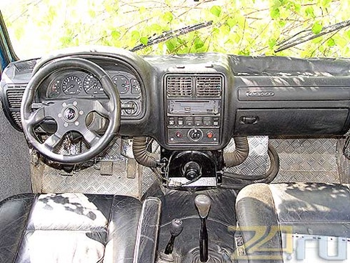 Огромный руль заменили на небольшой спортивный бублик, но он все равно чересчур выдавался в салон. Вспомните-ка ширину дверных проемов УАЗа - они явно рассчитаны на не слишком откормленных солдат. Да к тому же кузов машины поднялся до 35 см за счет больших колес и еще примерно на 5 после "лифтовки". Хозяин же - мужчина габаритный. Поступил второй важнейший заказ: устранить заднюю дверь по левому борту, а переднюю часть расширить и сделать, наконец, опускающиеся стекла. Мастерам пришлось снова налечь на работу. Собрали из двух узких дверок одну большую, а внутрь поставили электроподъемники. Стекла делали на заказ.